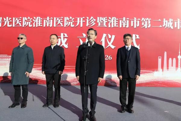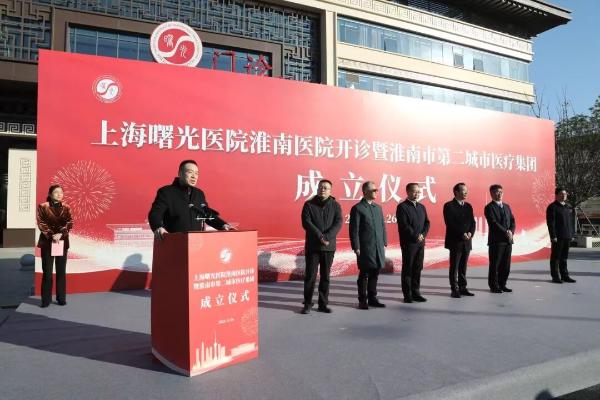 12月26日上午,上海曙光医院淮南医院开诊暨淮南市第二城市医疗集团成立仪式在上海曙光医院淮南医院山南新院区举行。淮南市委副书记、市长张志强出席并宣布上海曙光医院淮南医院正式开诊、淮南市第二城市医疗集团正式成立。上海中医药大学党委常委、副校长王拥军出席。淮南市委副书记时志远致辞。淮南市人民政府副市长陆晞主持仪式。上海中医药大学附属曙光医院党委副书记、院长林勋,党委委员、副院长元唯安,淮南市人民政府秘书长胡德春,安徽省中医药管理局综合处副处长杜鹏程,上海曙光医院淮南医院执行院长胡峻,以及淮南相关市直部门、县区负责人出席仪式。