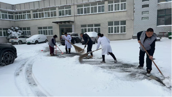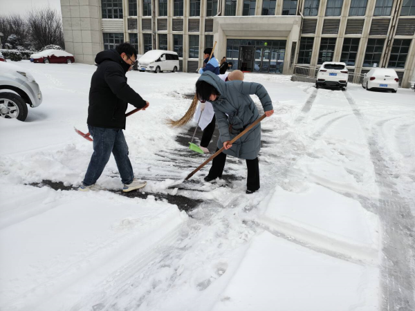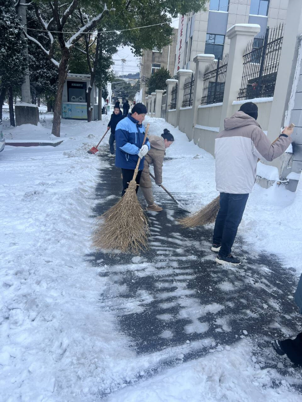 各单位党员干部带头、全体职工踊跃参与扫雪除冰,重点清理了各单位主要通道、出入口、坡道等关键区域积雪。针对易滑结冰路段,采取科学除冰方式,适量使用环保融雪剂,辅以防滑垫设置,为群众出行打通安全通道。