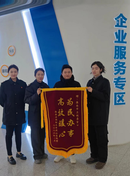 近日,淮南清雅制衣有限公司负责人来到市卫健委政务中心窗口,专程送来“高效暖心为民办事”锦旗,点赞窗口工作人员的优质高效服务。