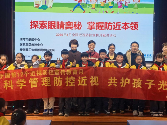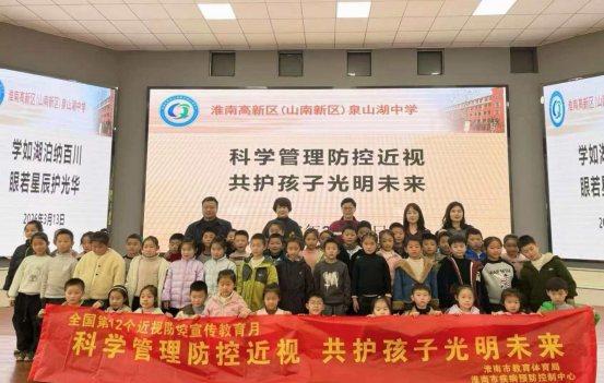 2026年3月12日—13日,淮南市疾病预防控制中心工作人员赴八公山区淮南九中、谢家集区一小、潘集区二十中、高新区泉山湖中学开展第12个全国近视防控宣传教育月活动。本次活动以“科学管理防控近视,共护青少年光明未来”为主题,围绕知识普及、习惯培养、实践体验、家校协同四大维度,通过科普讲座、专题宣讲等形式,将近视防控融入校园日常,为青少年视力健康筑起坚实防线。