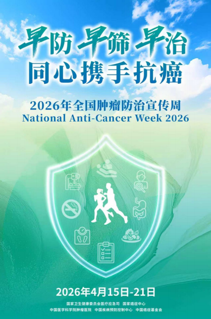 2026年4月15日-21日是第32个全国肿瘤防治宣传周。今年宣传周的主题为“早防早筛早治 同心携手抗癌”,旨在强调防治关口前移,持续推进病因预防、筛查诊治、社会共治、科普宣教等工作,全面控制癌症危害。